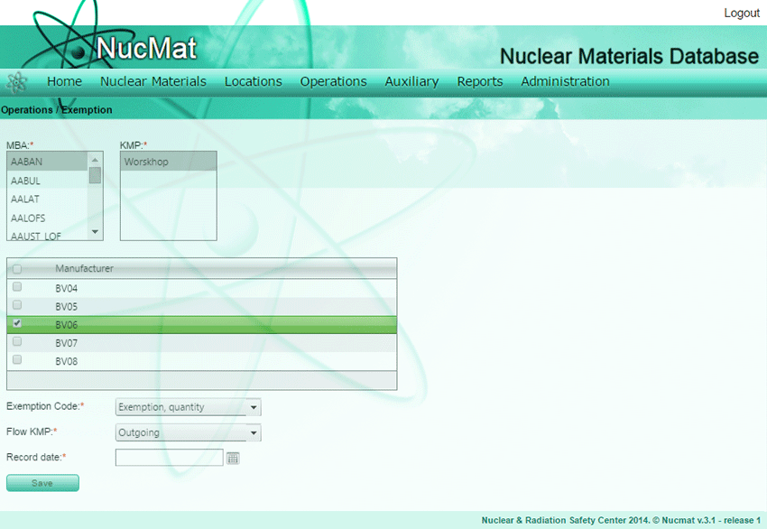 To register the exemption of nuclear material the user should use Exemption command from the Operations submenu (see Fig. 4.11) and provide with the following data in corresponding window: