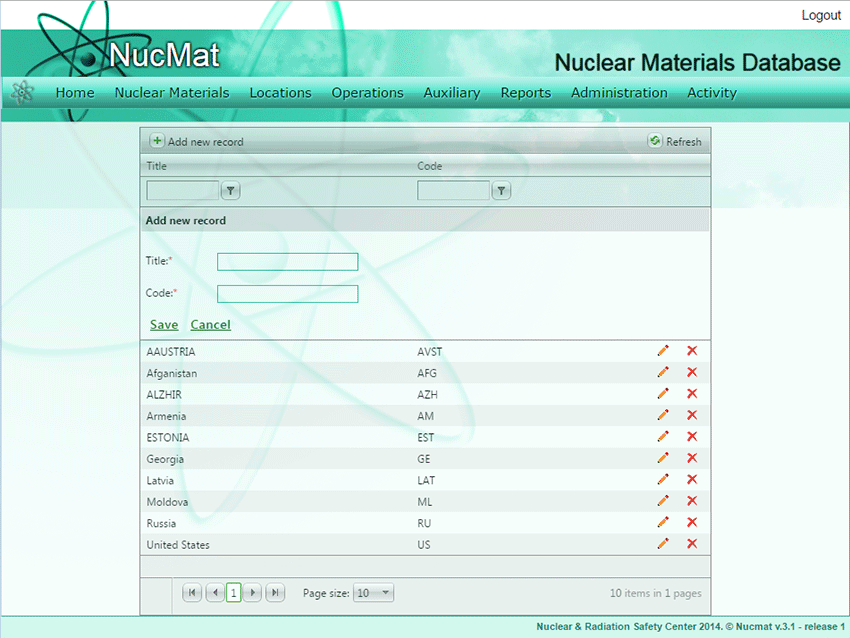 To add a new country the user should click on the Add new record command button. As a result, a new window opens and requires the user to input country name and Country Code identified by the IAEA and click Save (see Fig. 6.3).