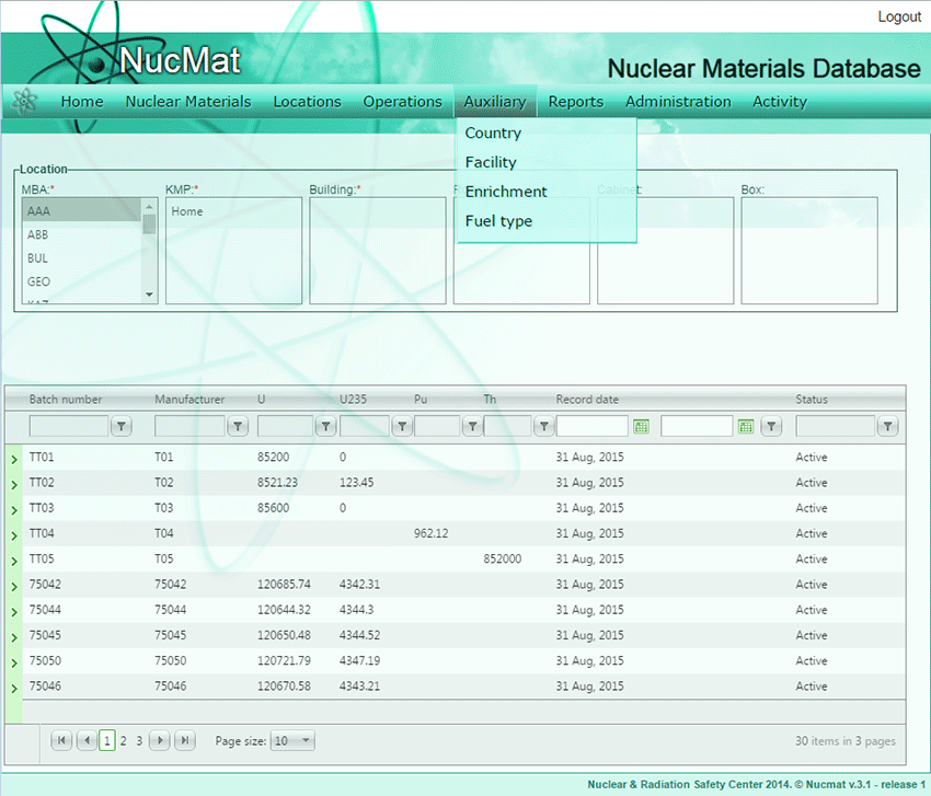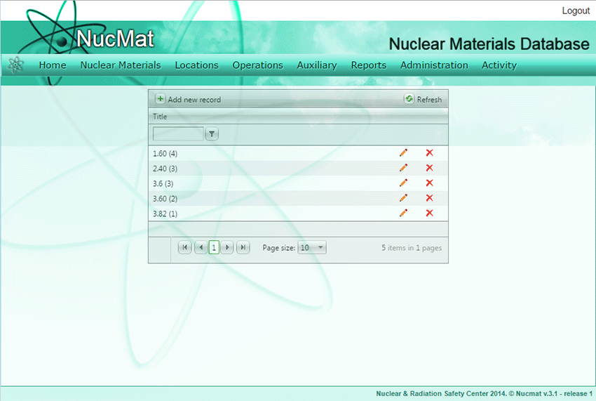 To create a new enrichment the user should click on the Add new record command button. In the new window the user has to enter nuclear material enrichment in a specific format (see Code 10) and click Save.