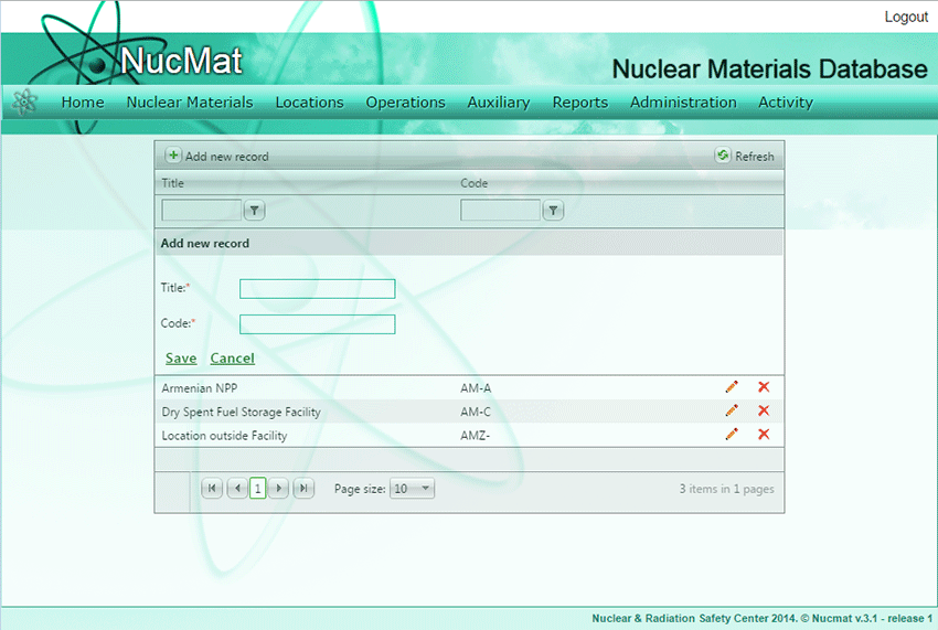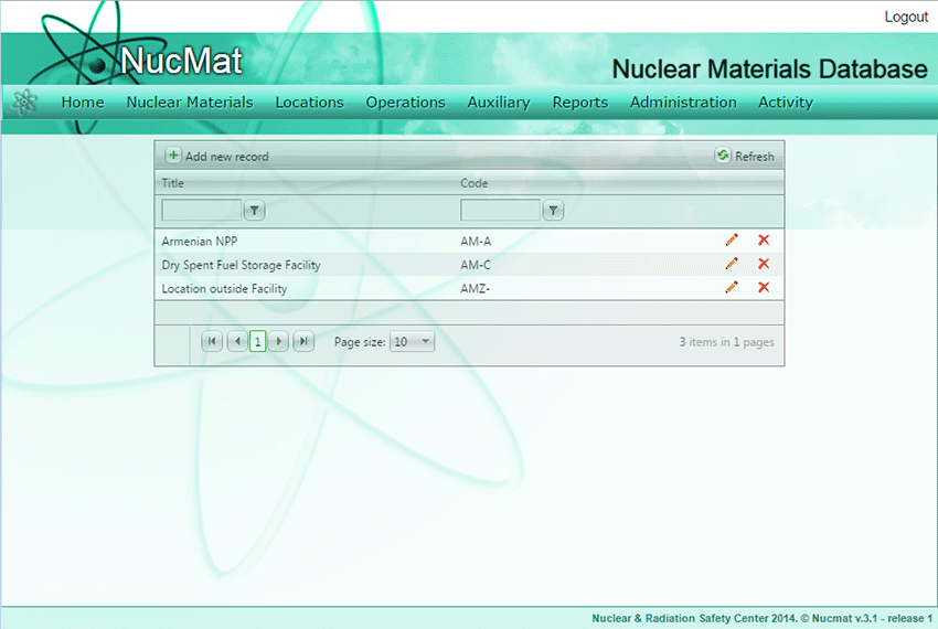 As a result, a new window opens which shows the list of facilities existing in NUCMAT (if any) and the Add new record command button (see Fig. 6.5).