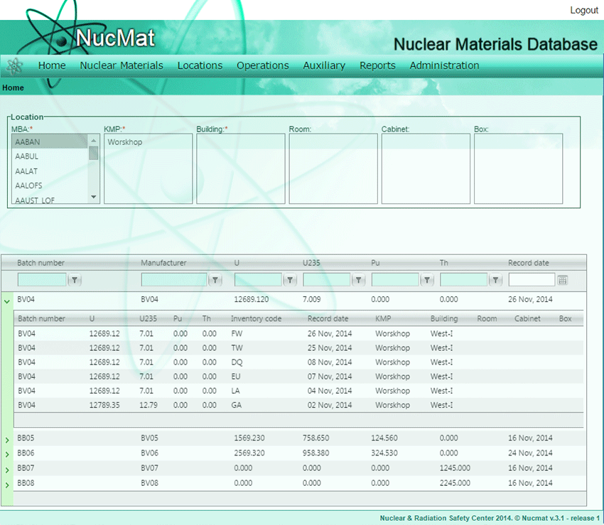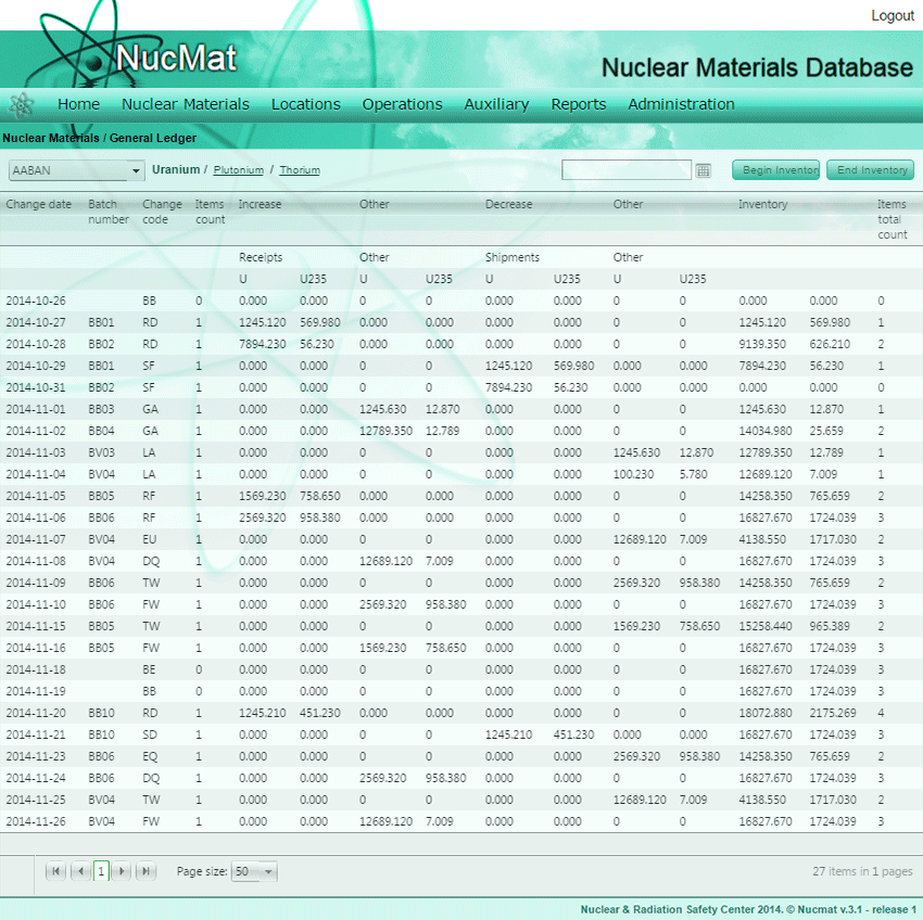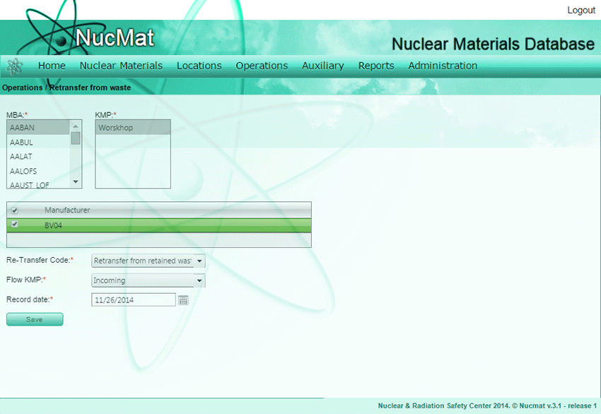 Then the user should select nuclear materials that should be retransferred from waste by selecting on manufacturer number and providing with flow KMP, retransfer date (see Fig. 7.18). Re-transfer of nuclear material (batch number BV04) automatically added in the General Ledger of MBA (Fig. 7.19) and in the history of material (Fig. 7.20).