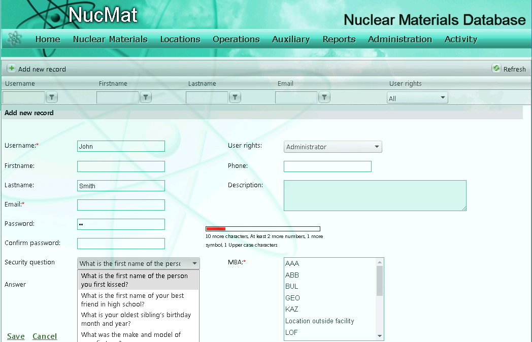 Password strength control: NUCMAT automatically checks the strength of user assigned password to contain at least 12 characters including: