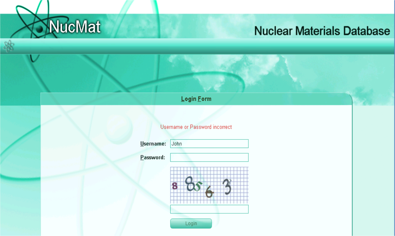 After 3 unsuccessful attempts of login top the NUCMAT systems recognizes it as a robot attack and blokes further automatic requests by requesting to fill in special character fields: