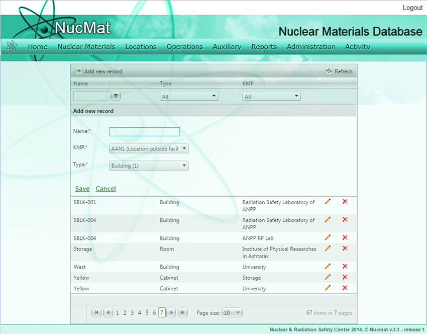 Пользователь может обновить параметры создаваемого/существующего здания или удалить здание из NUCMAT, с помощью кнопок Edit (редактировать) ( ) и Delete (удалить) () соответственно.